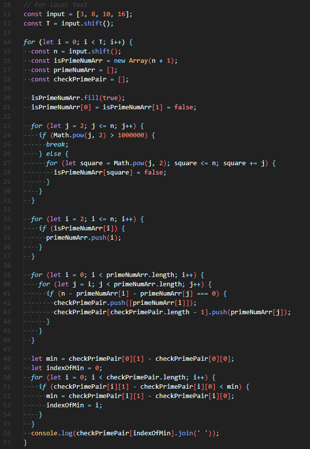 중첩 for loop을 열고, 입력 받은 n을 0으로 만들 수 있는 소수의 짝checkPrimePair 배열에 2차원 형식으로 저장해준다.