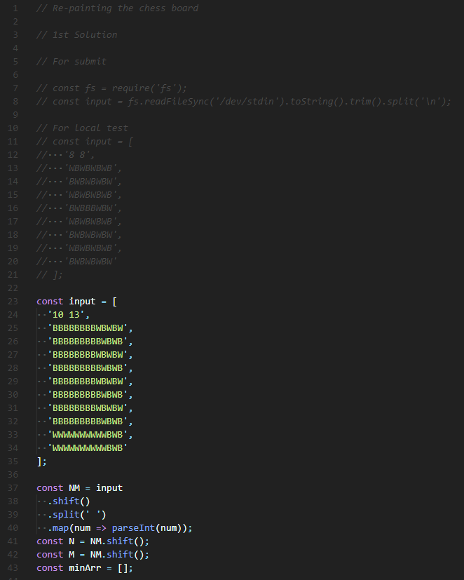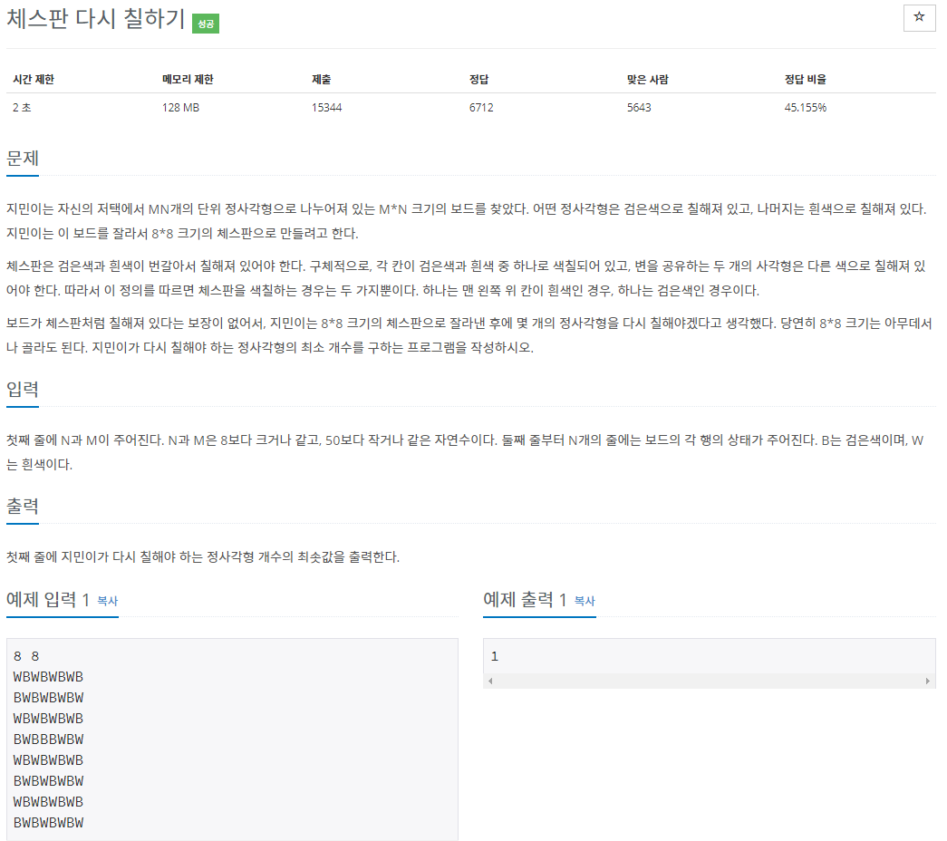 그리고 입력받은 체스판 크기만큼 8*8씩 잘라서 반복적으로 비교하여 모든 경우의 수를 저장했다.
