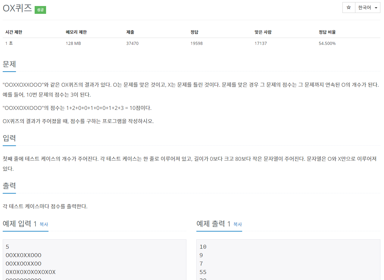 두 번째 for {}이 끝난 후 한 줄의 OX점수를 합한 eachSum을 출력해주었다.