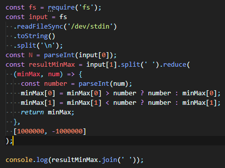 ✔ reduce의 첫 번째 parameter인 acc(위에서는 minMax)에 주어진 최대(1000000)와 최소(-1000000)범위를 배열로 초기 선언 해주고, 두 번째 parameter인 value(위에서는 num)를 통해 입력 받은 숫자를 하나씩 비교하여 최종 값을 받아낼 수 있다.