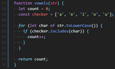 checker array에 모음(a, e, i, o, u)를 미리 저장해두고, for ... of loop안에서 checker.includes()를 이용해 모음이 있다면 count를 증가시키면서 모음의 개수를 찾아냈다. for ... of는 여러모로 참 유용하다.