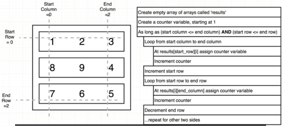 3X3 행렬 Test Case를 그려놓고 패턴을 파악하다보니 마지막 for loop의 진행 방향을 놓쳤었다.