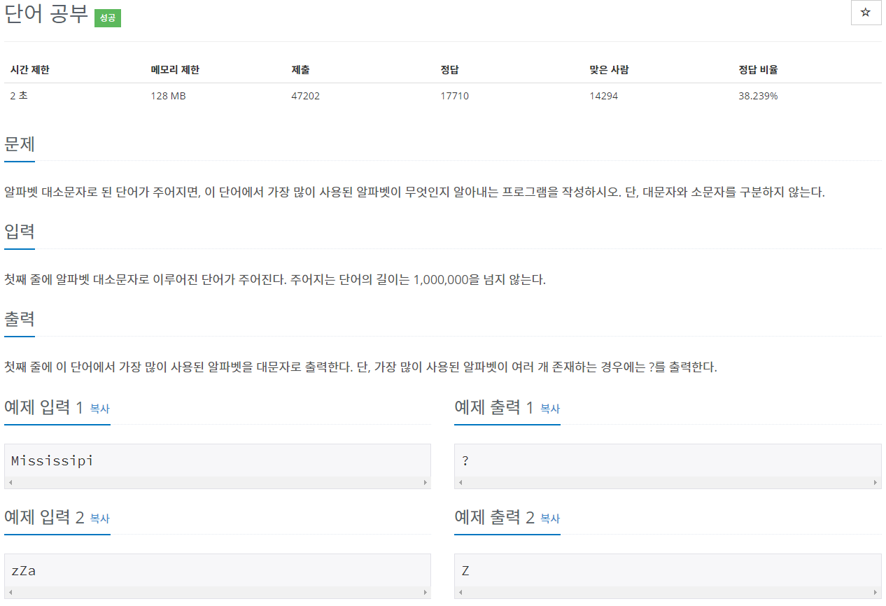 결과적으로, 만약 counter > 1이라면 '?'를 출력하고 return, 아니라면 maxChar(가장 많이 쓰인 문자)를 출력해주었다.
