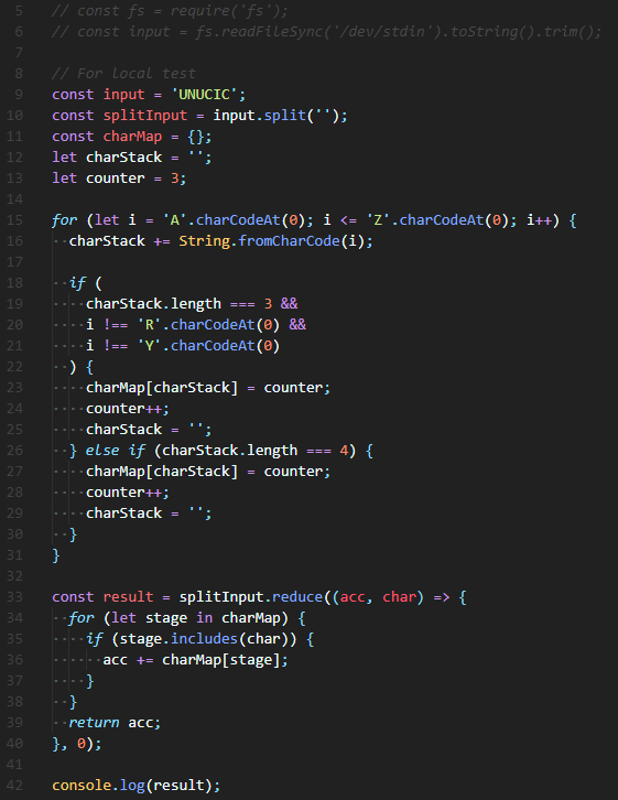 그렇게 입력받은 값 중에 각 key에 해당하는 문자가 있다면, acc에 해당 key의 value를 중복 저장해주고 return 해주었다.