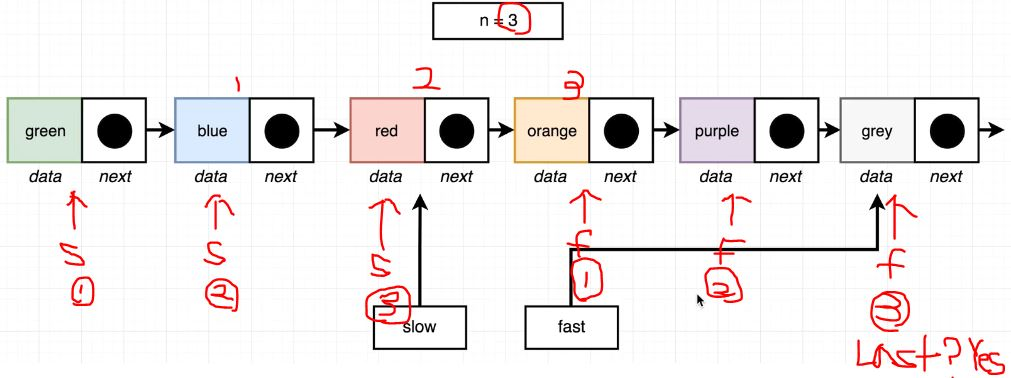 결과적으로, fast는 마지막 node를, slow는 뒤에서부터 n번째 떨어진 node를 의미하게 된다.