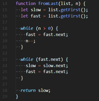 🔮 while loop을 이용해 fast를 n만큼 이동시켜주고, 또 다시 while loop을 이용해 slow와 fast를 이동시켜준다.