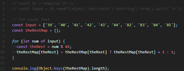 그런 후 마지막에 Object.keys(theRestMap).length 를 출력하여 key의 개수(길이)만큼 출력하면 그것이 나머지의 개수다.