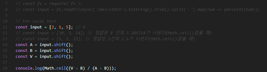 | // console.log(Math.ceil((V - A) / (A - B)) + 1); |