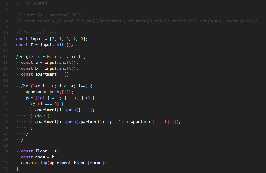 | apartment[i].push(apartment[i][j - 1] + apartment[i - 1][j]); |