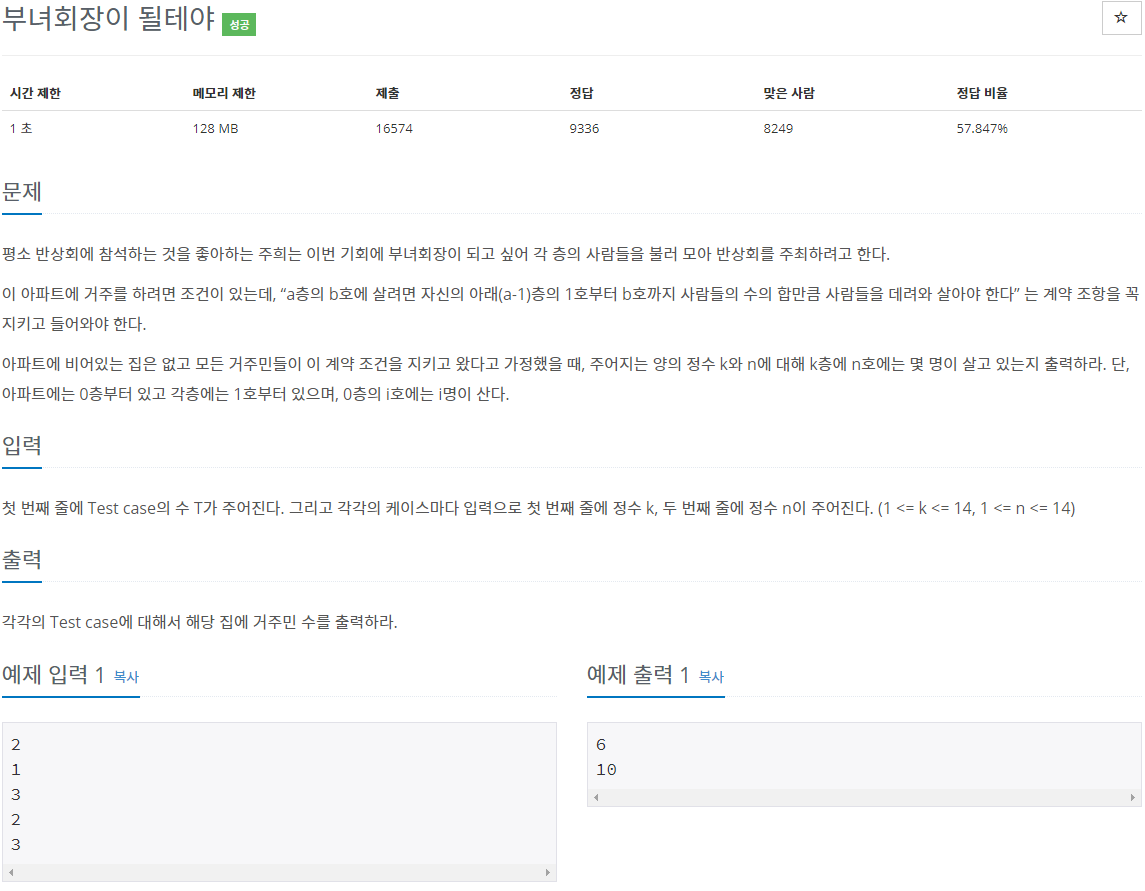 😊 문제의 의도는 a-1층의 1호부터 b호까지 모두 더하라는 것이 아닐 것이다. 물론 더해도 된다. 하지만 시간이 오래 걸린다.