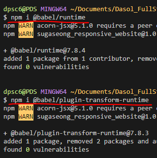 동기 비동기 작업을 수행할때 Babel 사용시 위의 두가지 종속성을 설치하고 .babelrc 파일을 수정해야 한다.