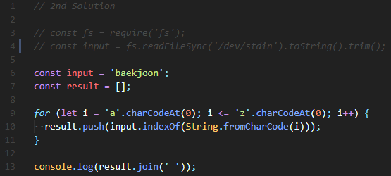 단순하게 한 번 풀어보고자, 모든 알파벳을 배열에 담고 비교해보았다. for ... of를 이용해서 알파벳을 하나씩 반복해주고,