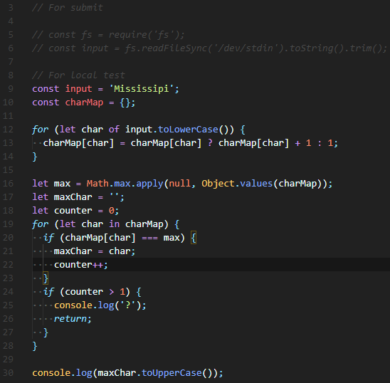 결과적으로, 만약 counter > 1이라면 '?'를 출력하고 return, 아니라면 maxChar(가장 많이 쓰인 문자)를 출력해주었다.