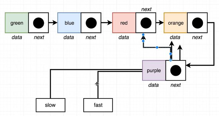 slow와 fast의 시작점은 같고, slow는 1칸, fast는 2칸씩 이동한다.
