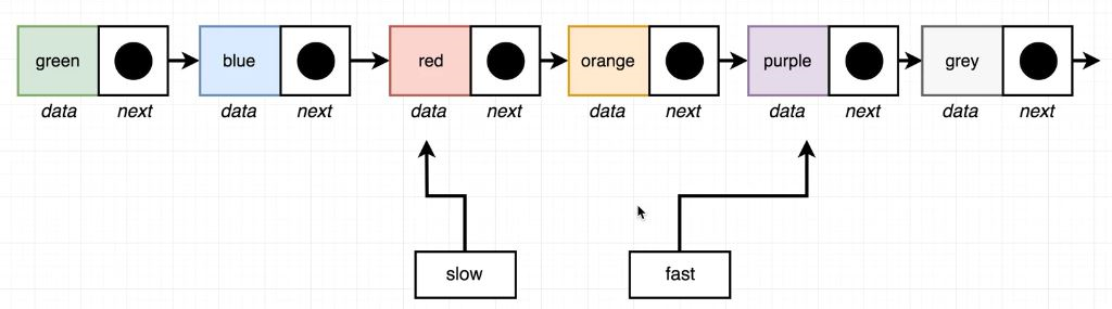 그때 slow의 위치는 중간(즉, Lists 전체 크기에서 반을 잘랐을 때 앞부분 반의 마지막 Node)이다.