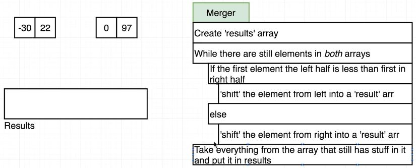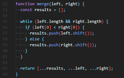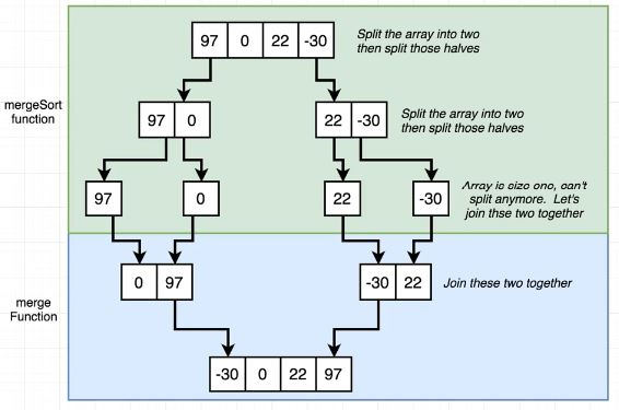 이렇게 Merge function은 간단하다. 양쪽 배열을 비교하고 작은 값을 먼저 넣어주면 된다.