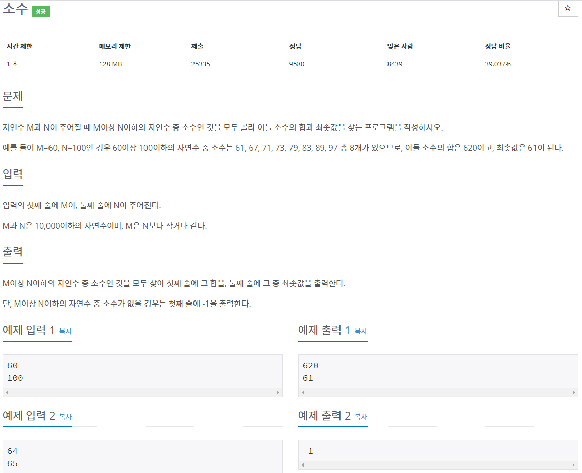 😊 최솟값을 구해주기 위해 Array를, 소수값의 합을 구해주기 위해 sum 변수를 추가했다.