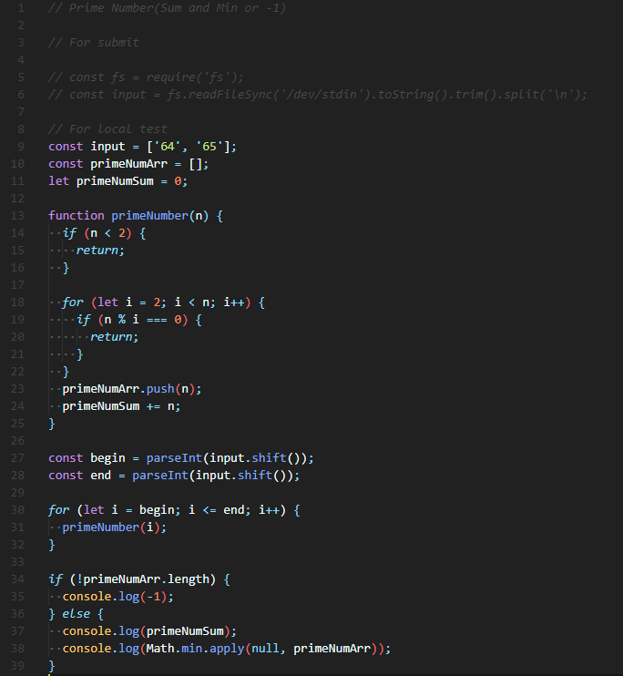 소수를 구하는 부분은 function으로 따로 빼주었으며,