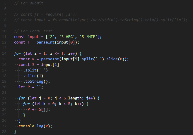 마지막으로, 문자열의 길이 S만큼 반복하는 for loop안에 반복할 수 R만큼 반복하는 for loop을 열어줘서 같은 문자를 P에 중복 대입해준다. 한 문장이 끝날 때마다 console.log(P);를 통해 출력해주면 된다.